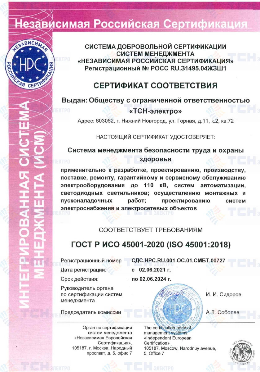 Сертификат соответствия системы охраны труда и безопасности персонала требованиям ГОСТ Р 45001_2020