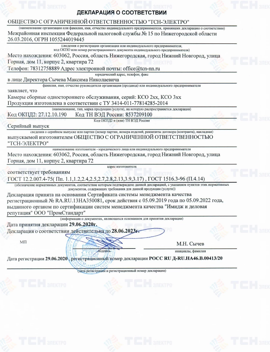 Декларация соответствия КСО-216Т на номинальное напряжение 6-10 кВ, номинальный ток до 1250 А
