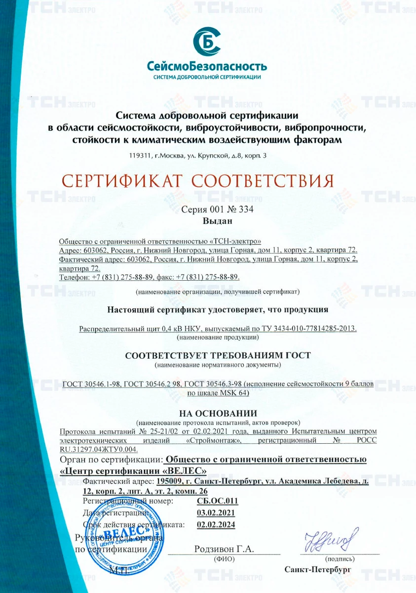 Сертификат соответствия НКУ требованиям сейсмостойкости