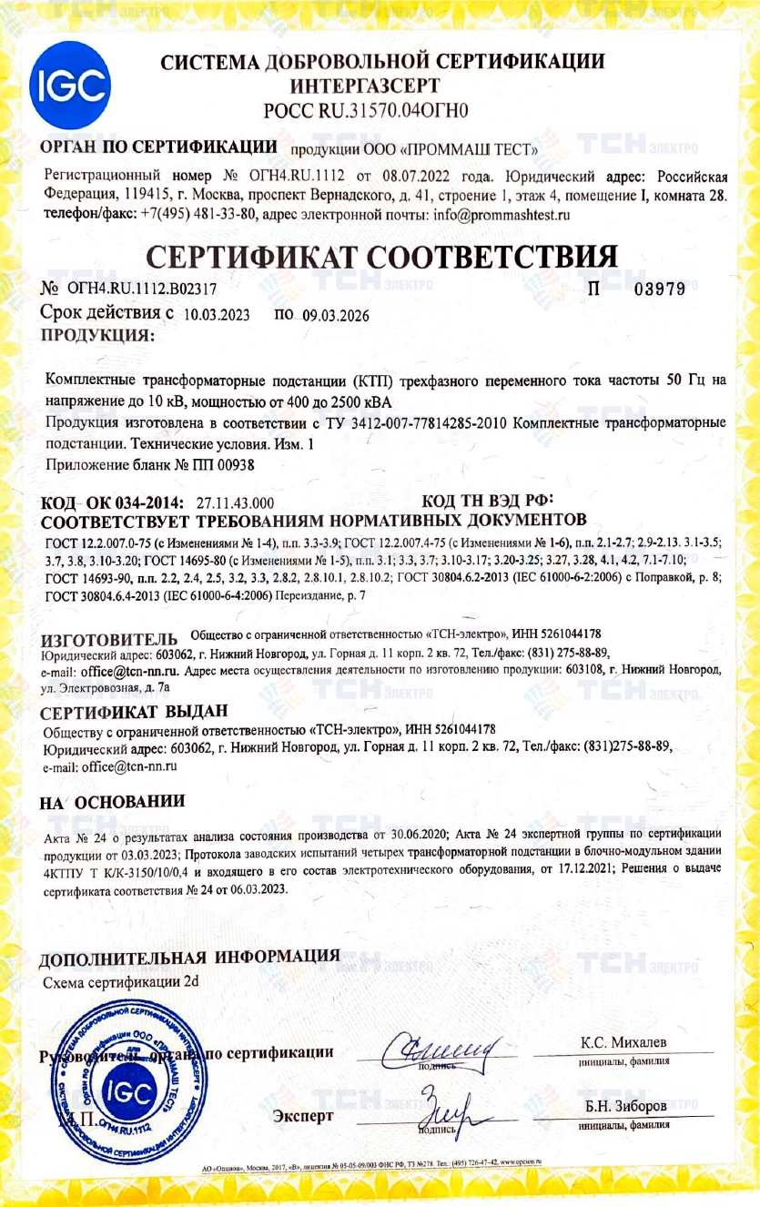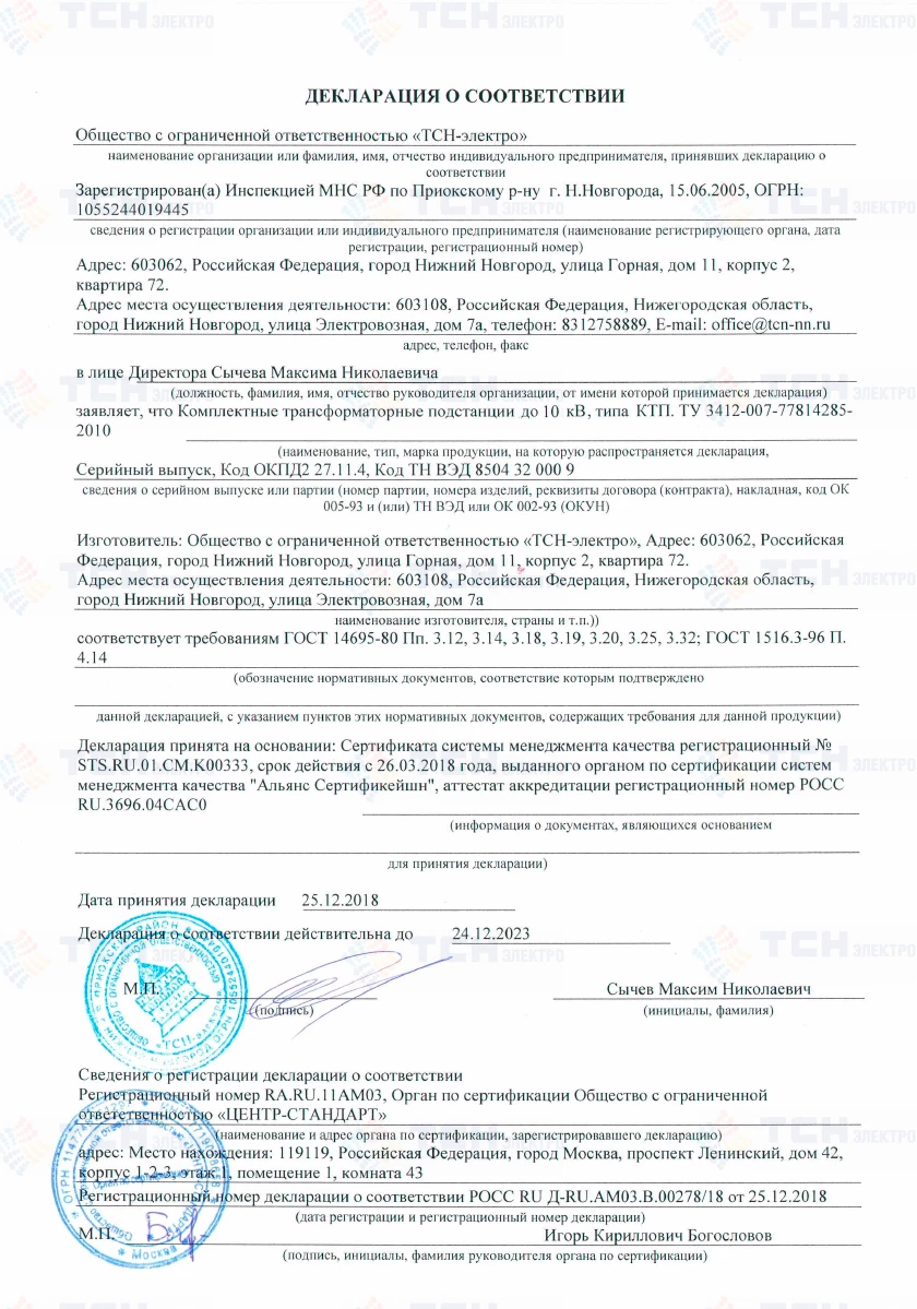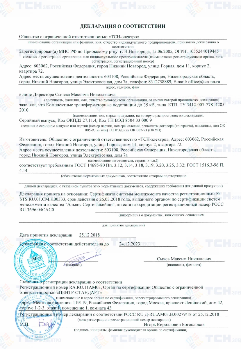 Декларация о соответствии КТП до 10 кВ требованиям ГОСТ