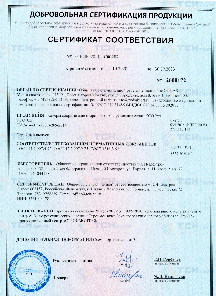 Сертификат соответствия КСО-216Т на номинальное напряжение 6-10 кВ, номинальный ток до 1250 А
