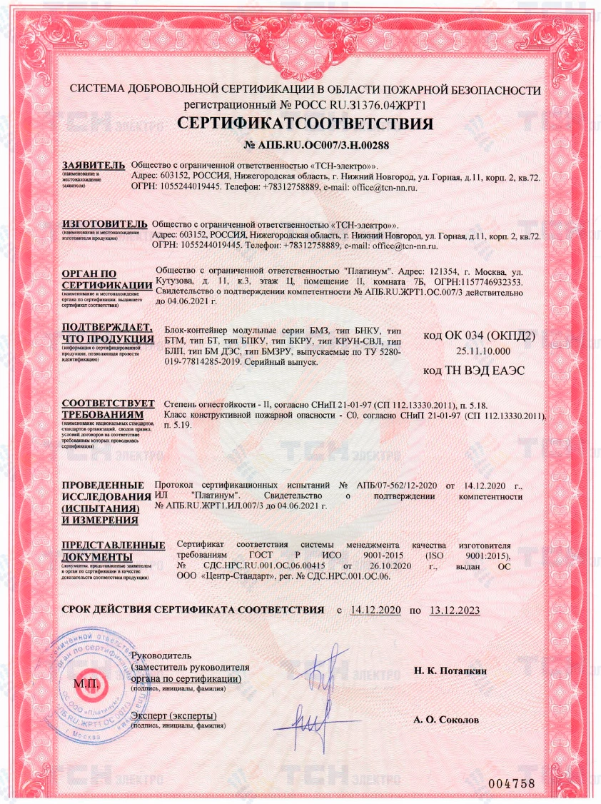 Сертификат соответствия БМЗ типов БНКУ, БТМ, БТ, БПКУ, БКРУ, КРУН-СВЛ, БЛП, БМ ДЭС, БМЗРУ требованиям пож. безоп.